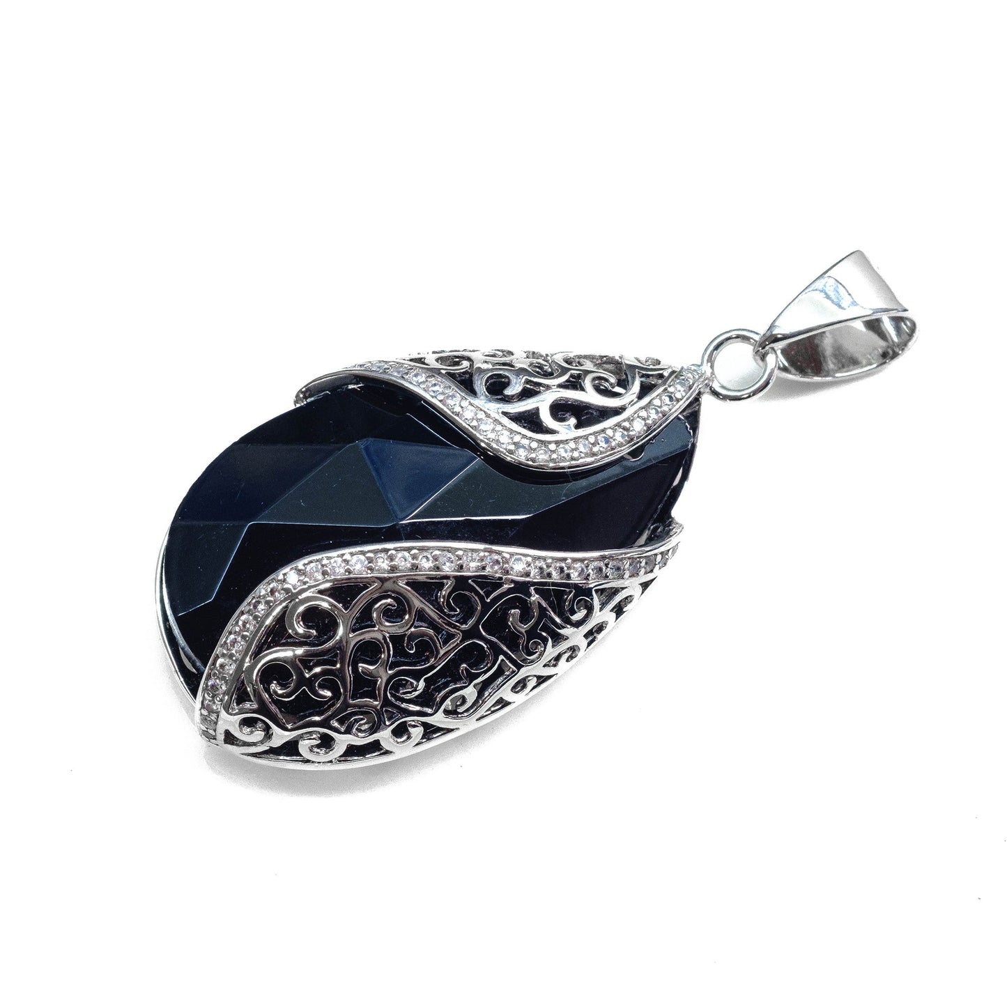 Una elegante gota de cristal negro con zirconias blancas a lo largo de sus lados, creando un contraste de colores que añade un toque de sofisticación y brillo a tu accesorio.
